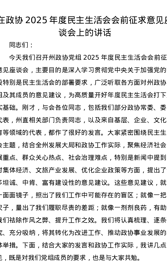 在政协2025年度xxxxx会前征求意见座谈会上的讲话