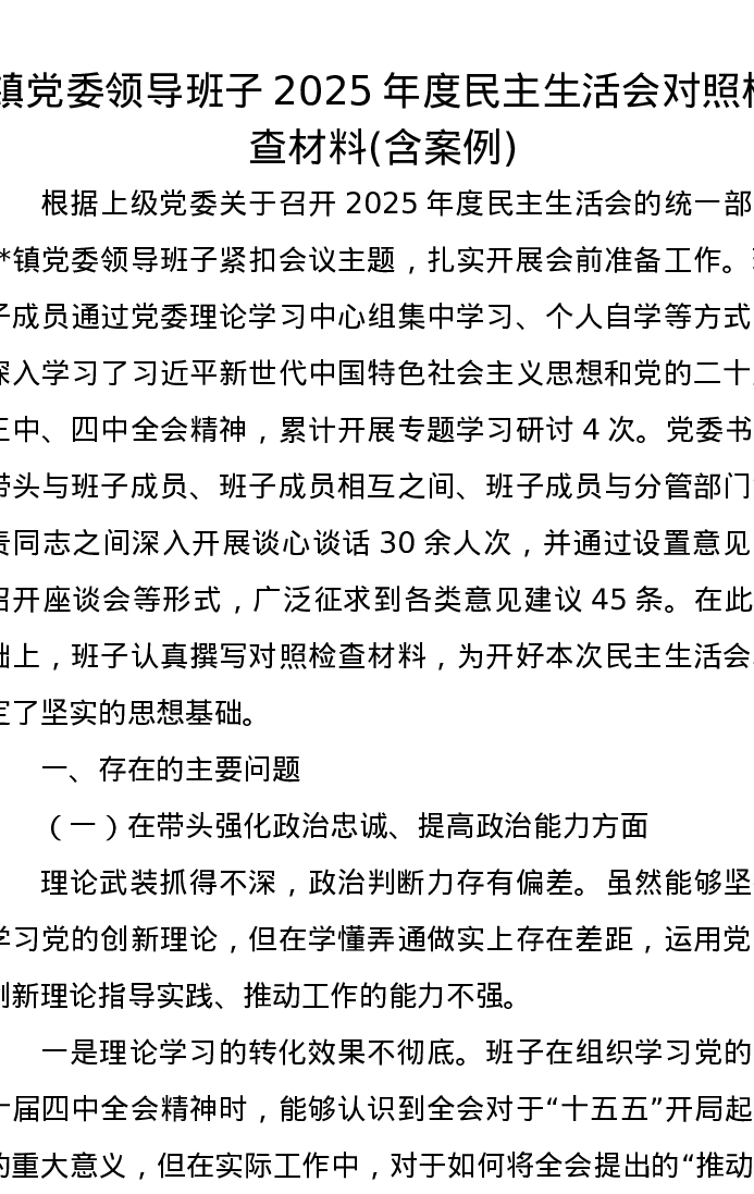 镇党委领导班子2025年度xxxxx对照检查材料(含案例)