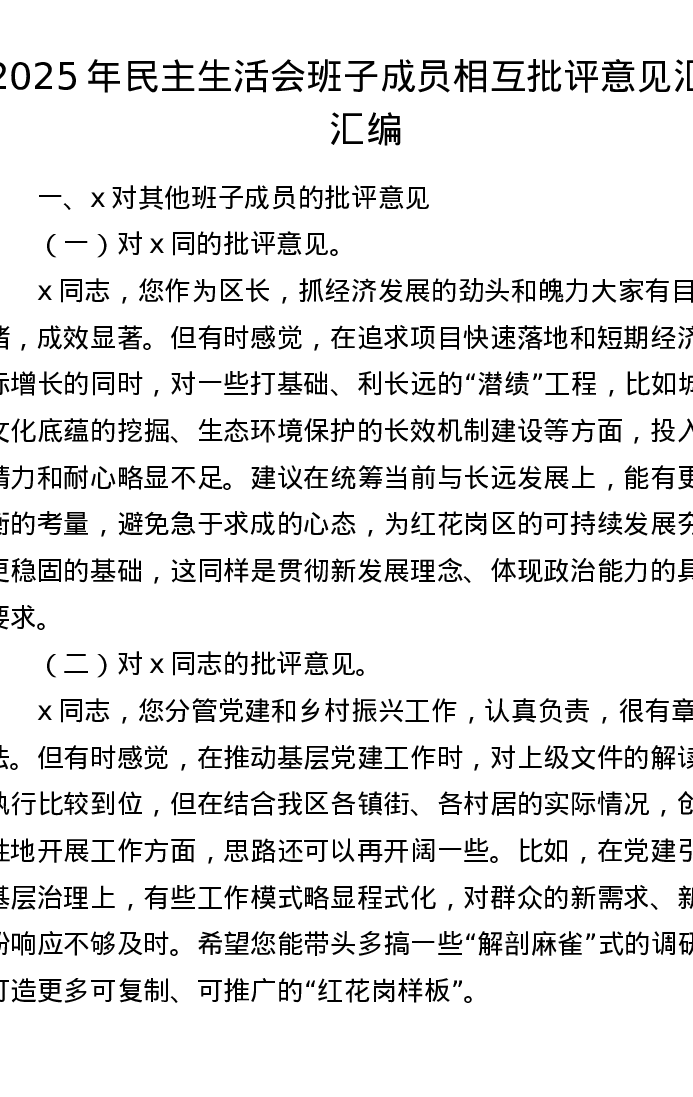 2025年xxxxx班子成员相互批评意见汇总汇编