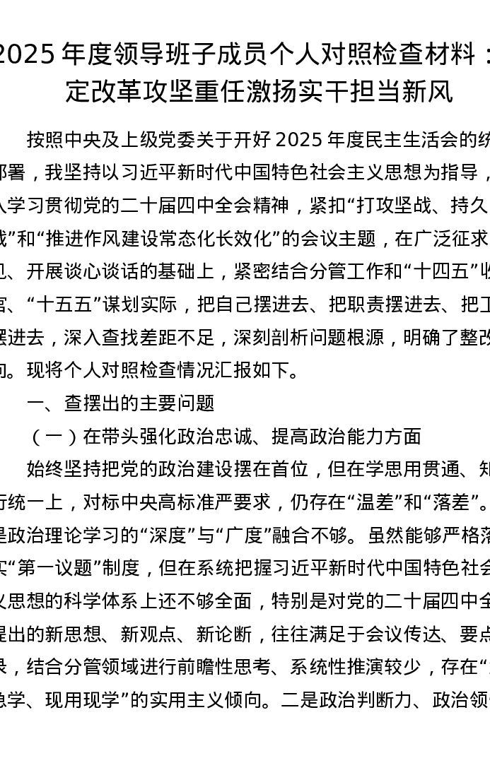 2025年度领导班子成员个人对照检查材料:锚定改革攻坚重任 激扬实干担当新风
