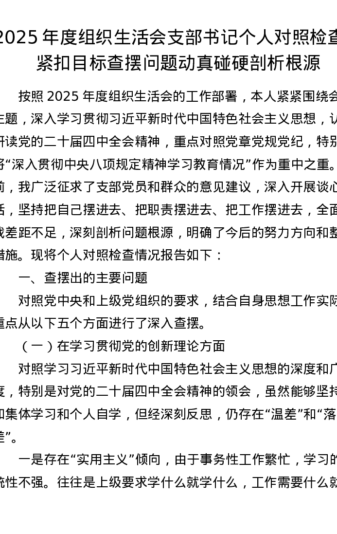 2025年度组织xxx支部书记个人对照检查:紧扣目标查摆问题 动真碰硬剖析根源