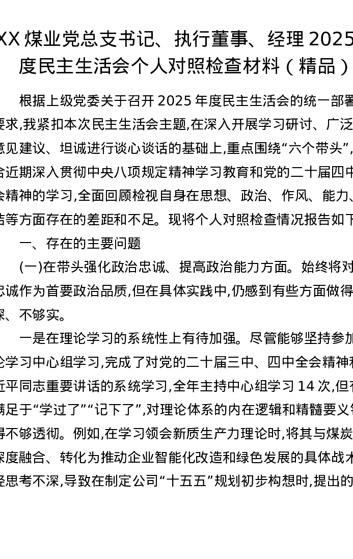 XX煤业党总支书记、执行董事、经理2025年度xxxxx个人对照检查材料