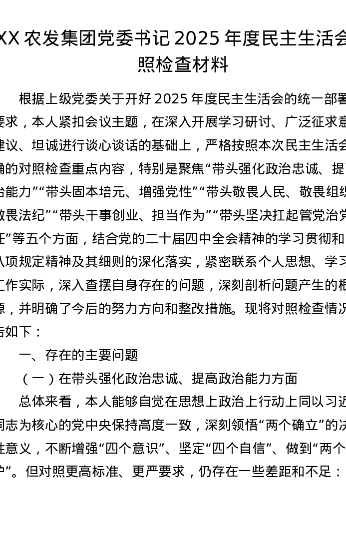XX农发集团党委书记2025年度xxxxx对照检查材料