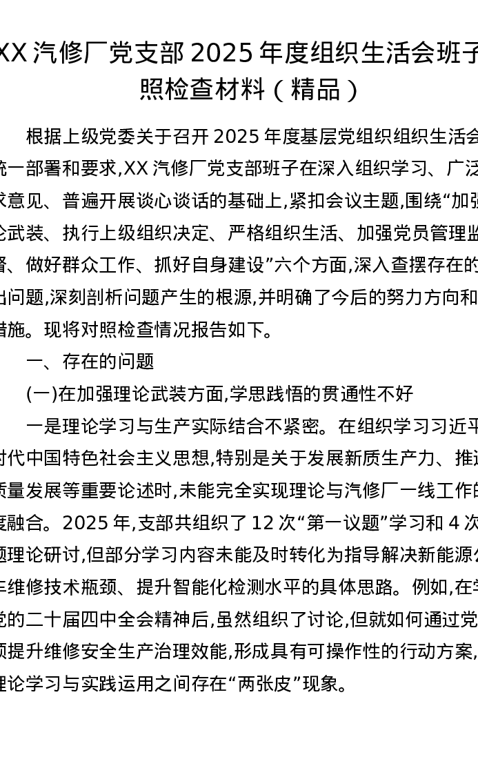 XX汽修厂党支部2025年度组织xxx班子对照检查材料