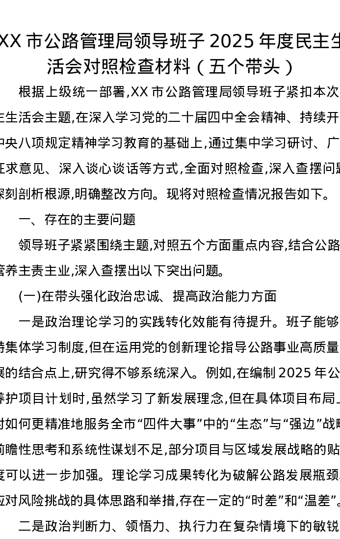 XX市公路管理局领导班子2025年度xxxxx对照检查材料(五个带头)