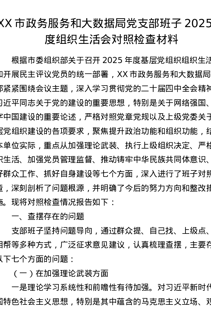 XX市政务服务和大数据局党支部班子2025年度组织xxx对照检查材料