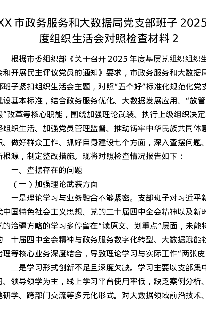 XX市政务服务和大数据局党支部班子2025年度组织xxx对照检查材料2
