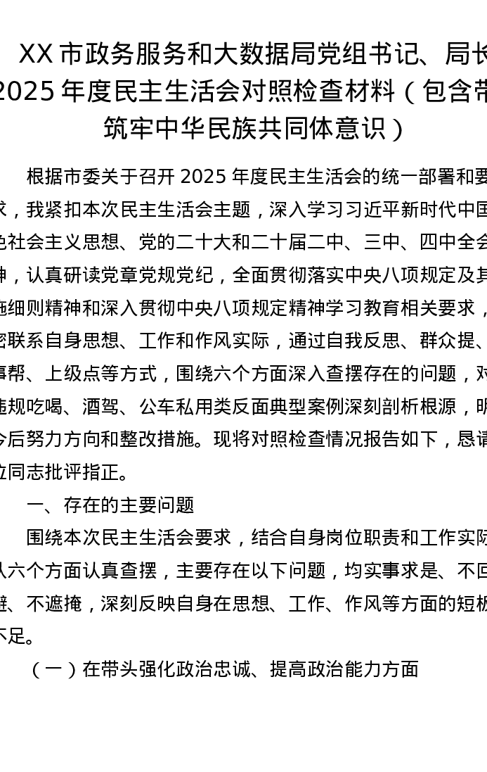 XX市政务服务和大数据局党组书记、局长2025年度xxxxx对照检查材料(包含带头筑牢中华民族共同体意识)