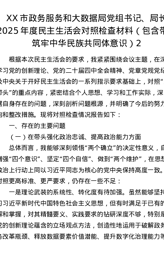 XX市政务服务和大数据局党组书记、局长2025年度xxxxx对照检查材料(包含带头筑牢中华民族共同体意识)2