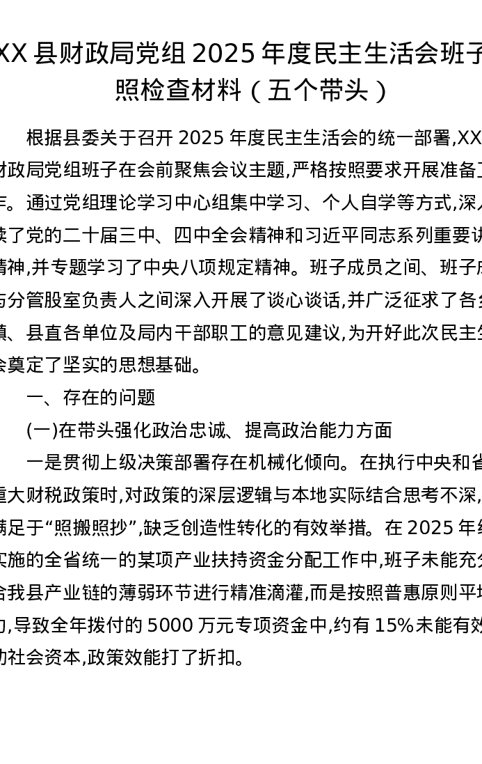XX县财政局党组2025年度xxxxx班子对照检查材料(五个带头)