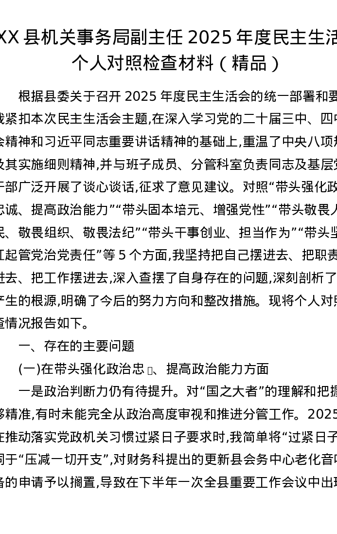 XX县机关事务局副主任2025年度xxxxx个人对照检查材料
