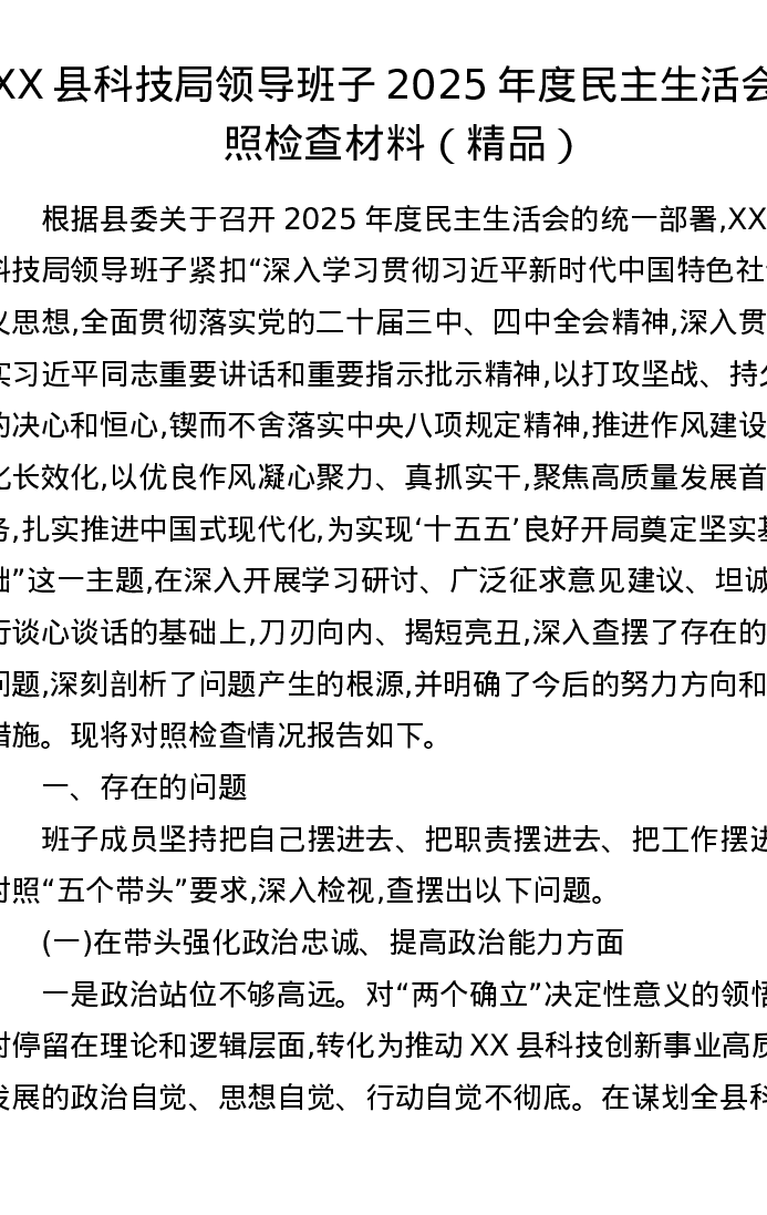 XX县科技局领导班子2025年度xxxxx对照检查材料