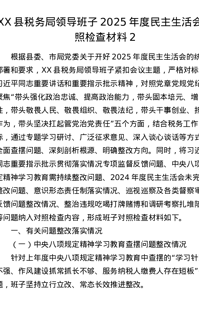 XX县税务局领导班子2025年度xxxxx对照检查材料2