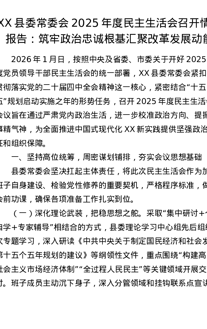 XX县委常委会2025年度xxxxx召开情况报告:筑牢政治忠诚根基 汇聚改革发展动能