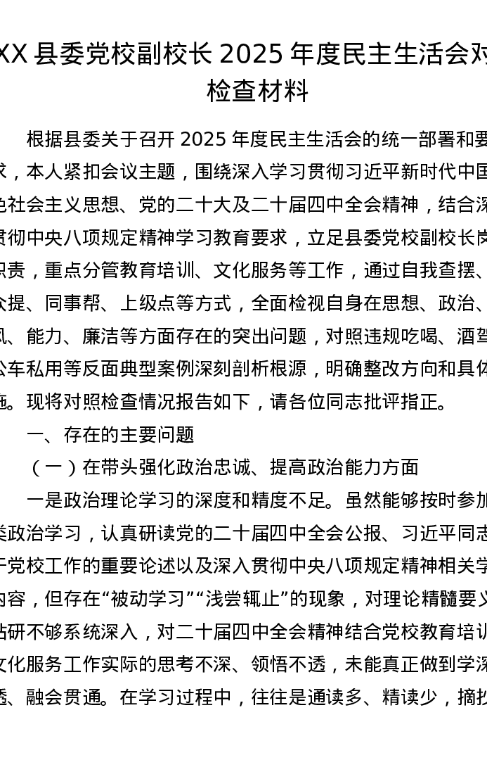 XX县委党校副校长2025年度xxxxx对照检查材料
