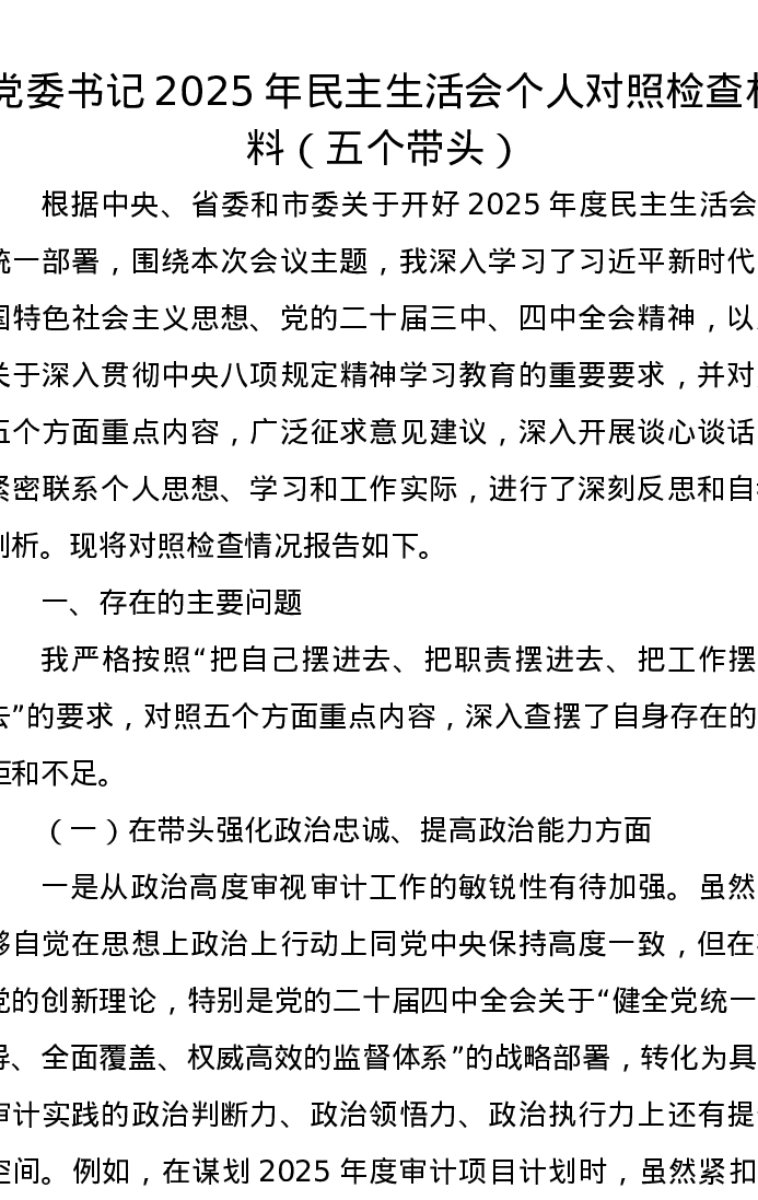 党委书记2025年xxxxx个人对照检查材料(五个带头)