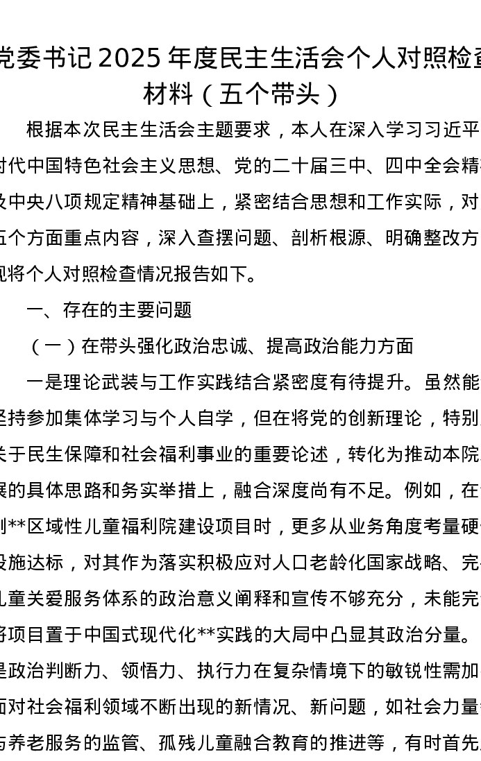 党委书记2025年度xxxxx个人对照检查材料(五个带头)