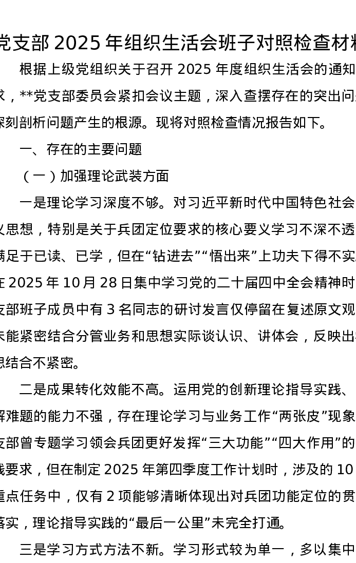 党支部2025年组织xxx班子对照检查材料