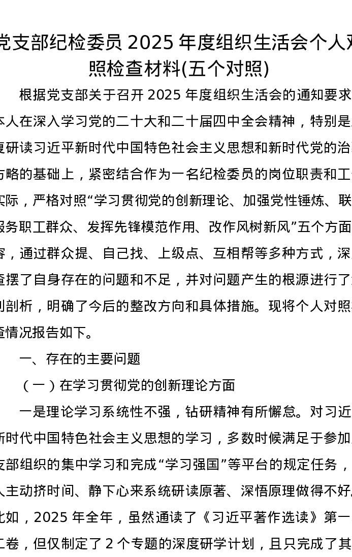 党支部纪检委员2025年度组织xxx个人对照检查材料(五个对照)