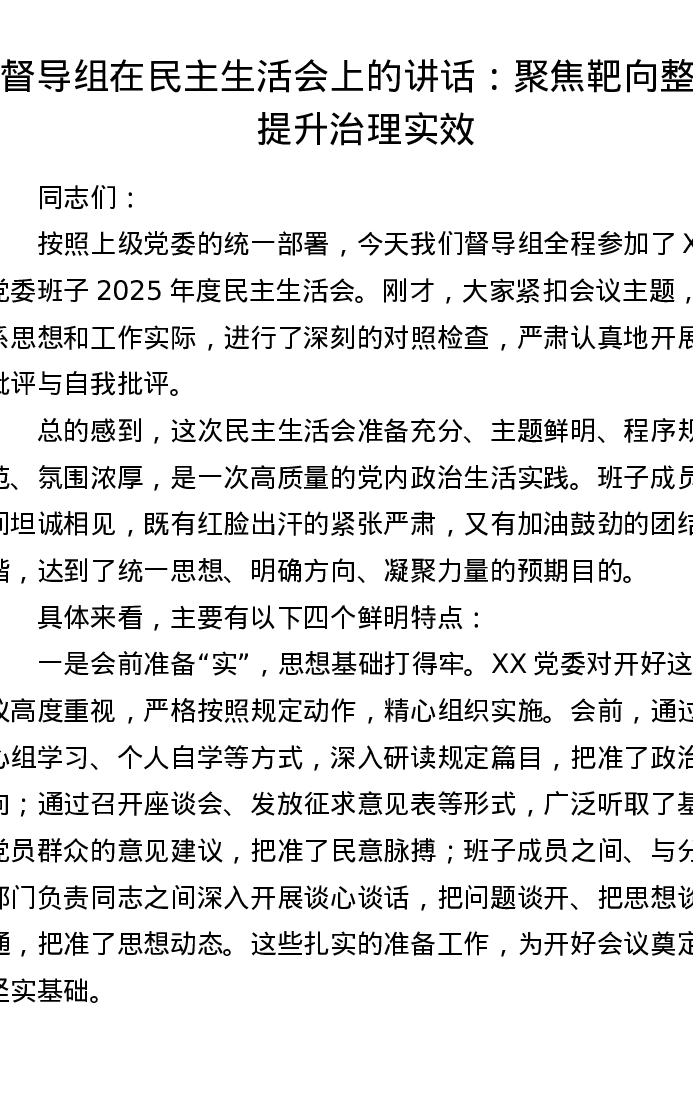 督导组在xxxxx上的讲话:聚焦靶向整改 提升治理实效
