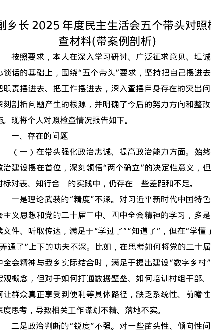 副乡长2025年度xxxxx五个带头对照检查材料(带案例剖析)