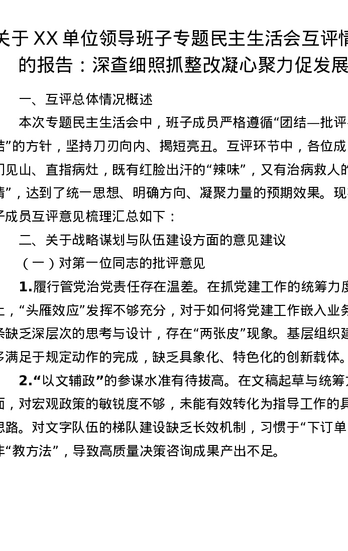 关于XX单位领导班子专题xxxxx互评情况的报告:深查细照抓整改 凝心聚力促发展