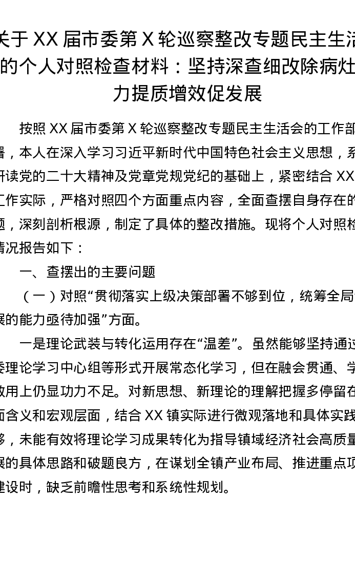 关于XX届市委第X轮巡察整改专题xxxxx的个人对照检查材料:坚持深查细改除病灶 聚力提质增效促发展