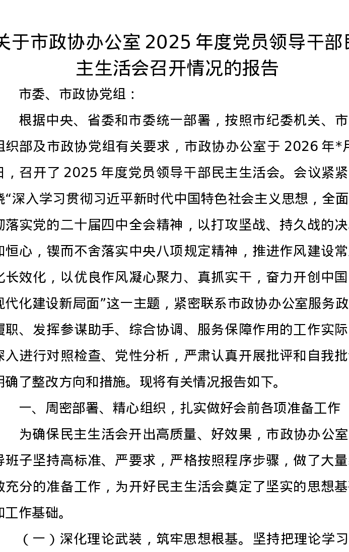 关于市政协办公室2025年度党员领导干部xxxxx召开情况的报告