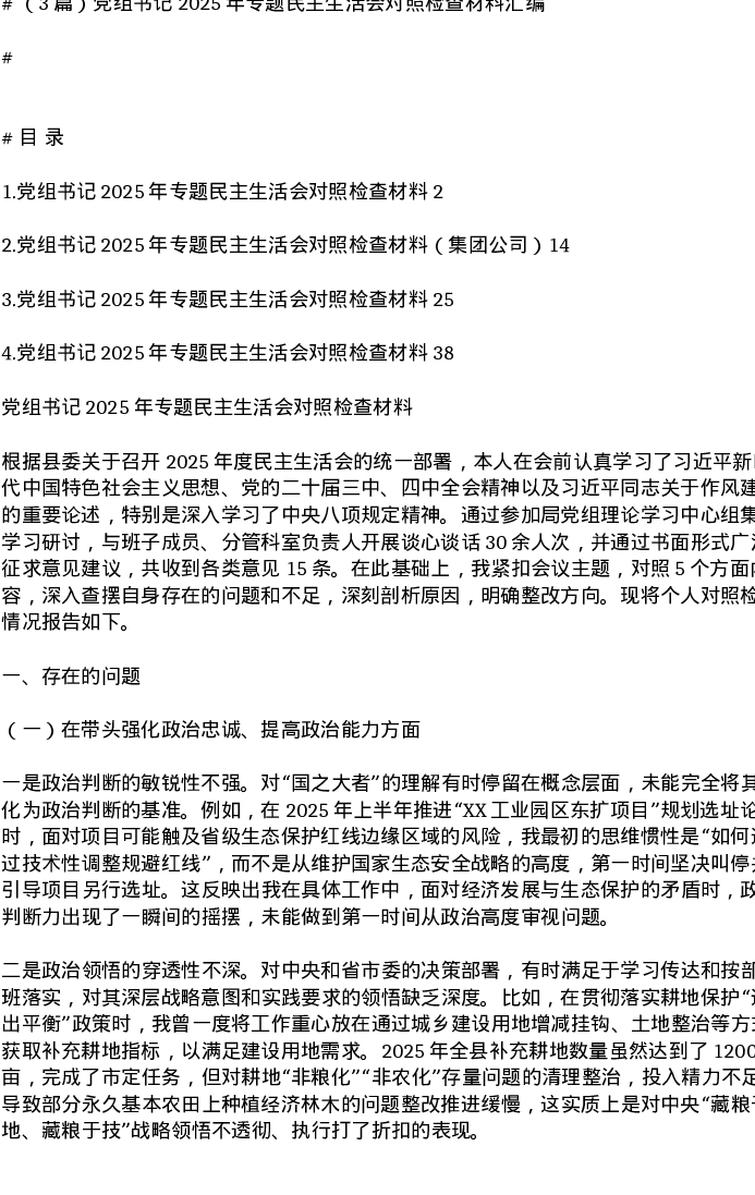 汇编:党组书记2025年专题xxxxx对照检查材料3篇