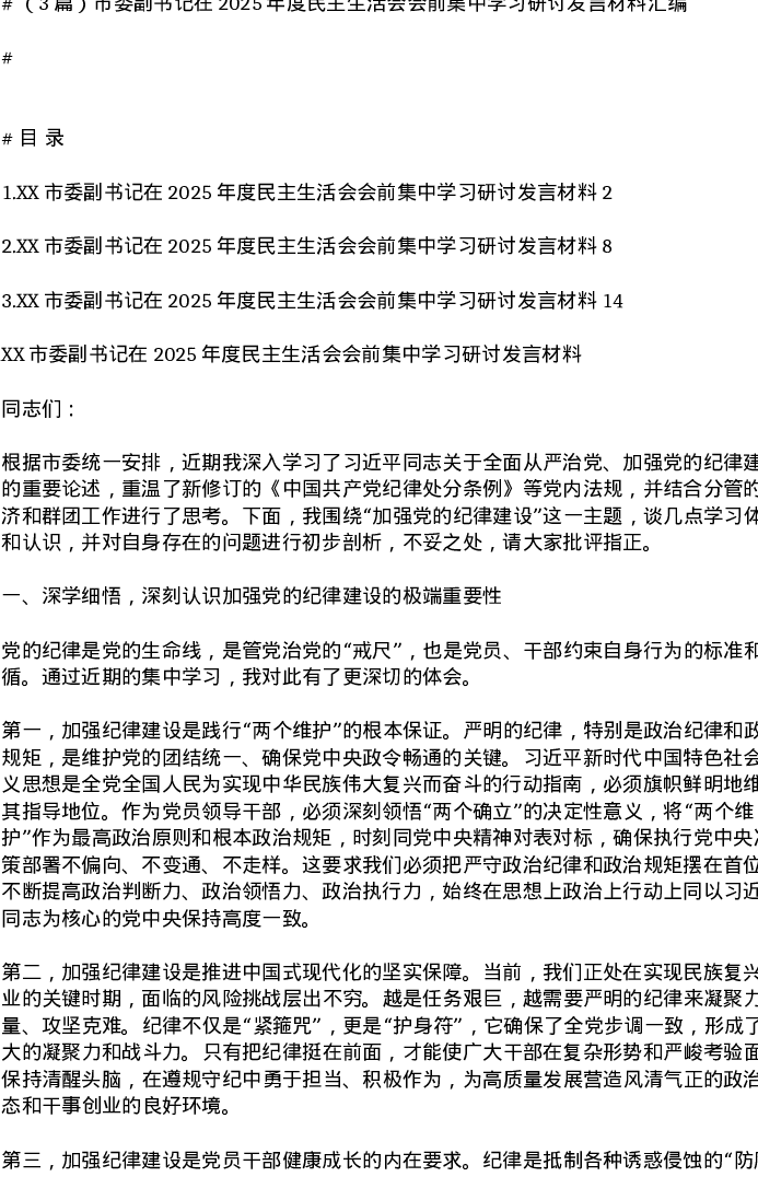 汇编:市委副书记在2025年度xxxxx会前集中学习研讨发言材料3篇