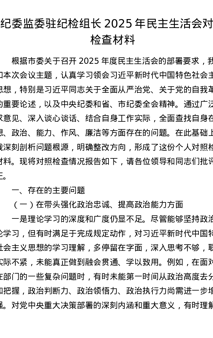 纪委监委驻纪检组长2025年xxxxx对照检查材料