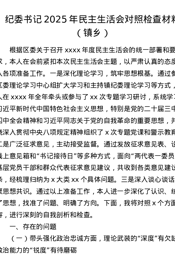 纪委书记2025年xxxxx对照检查材料(镇乡)