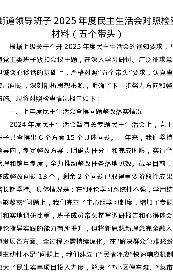 街道领导班子2025年度xxxxx对照检查材料(五个带头)