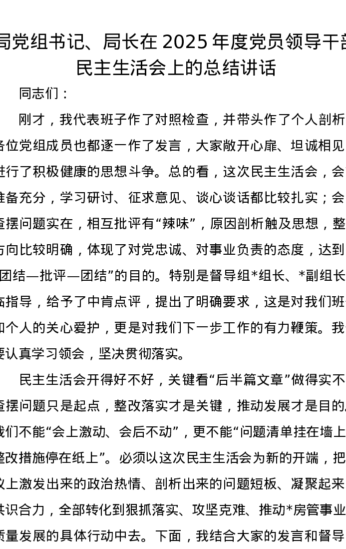 局党组书记、局长在2025年度党员领导干部xxxxx上的总结讲话