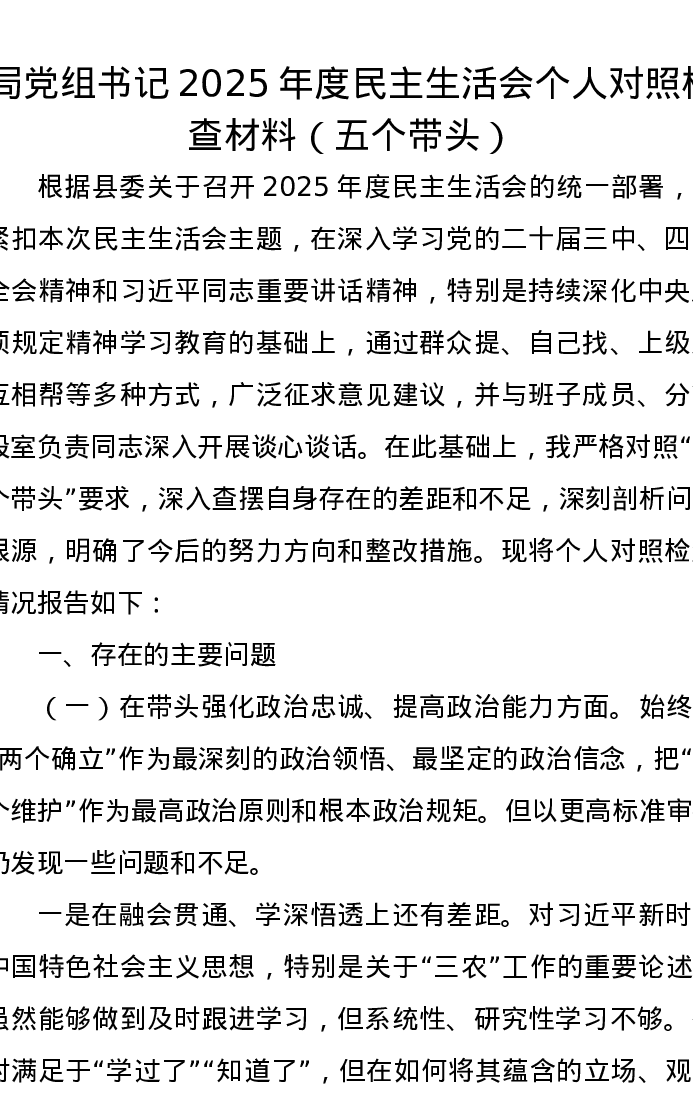 局党组书记2025年度xxxxx个人对照检查材料(五个带头)