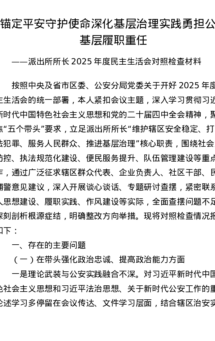 派出所所长2025年度xxxxx对照检查材料—锚定平安守护使命 深化基层治理实践 勇担公安基层履职重任