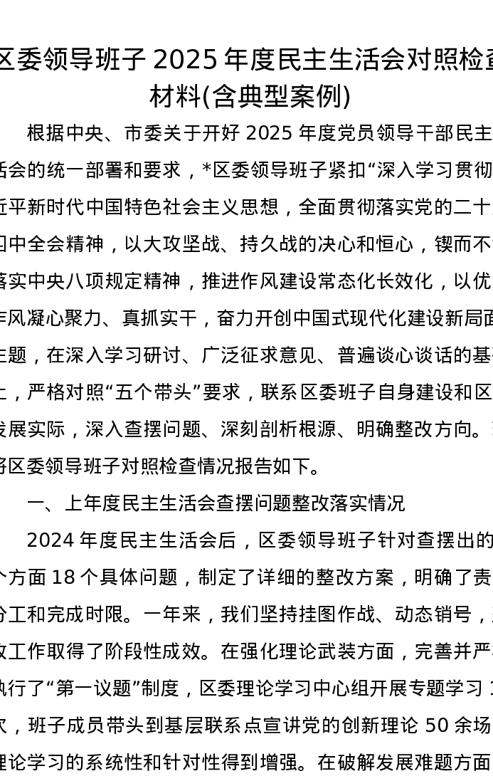 区委领导班子2025年度xxxxx对照检查材料 (含典型案例)