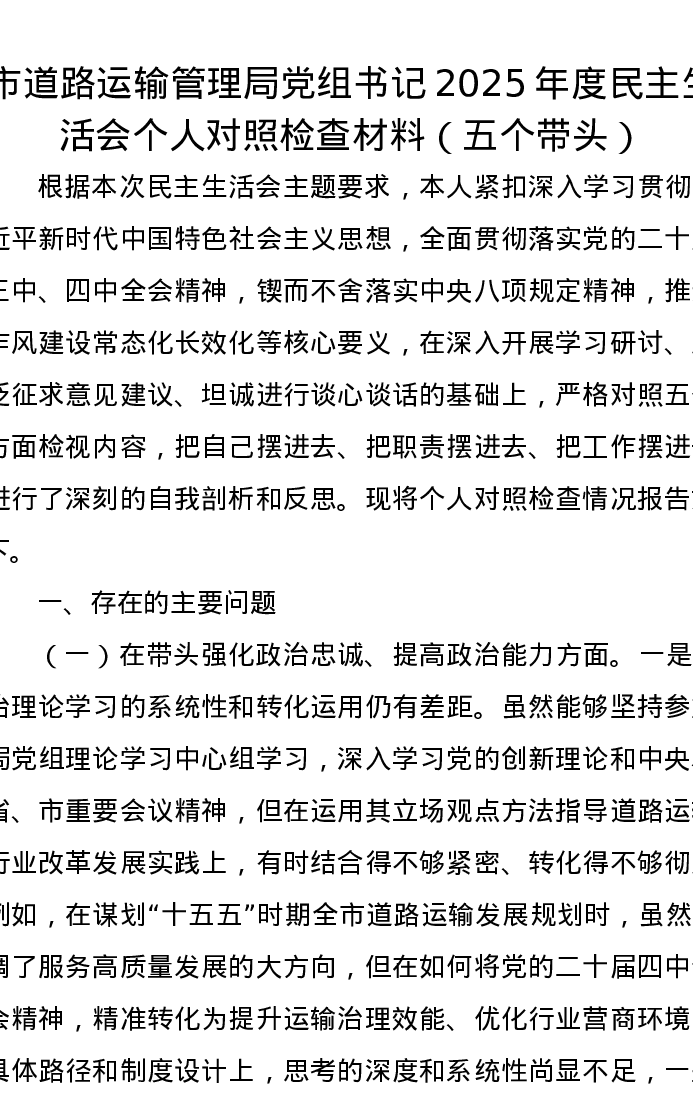 市道路运输管理局党组书记2025年度xxxxx个人对照检查材料(五个带头)