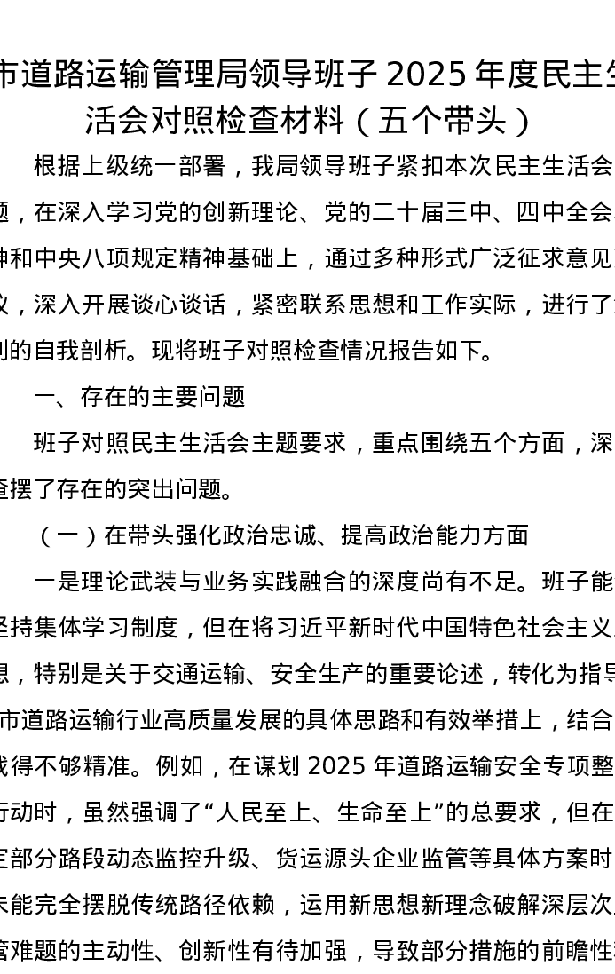市道路运输管理局领导班子2025年度xxxxx对照检查材料(五个带头)