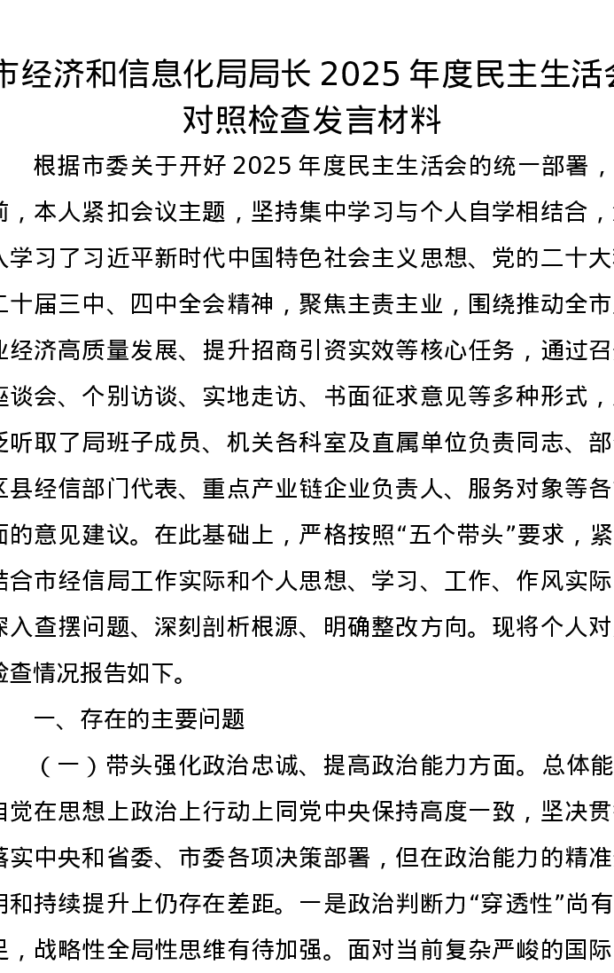市经济和信息化局局长2025年度xxxxx对照检查发言材料