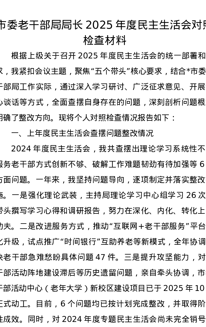 市委老干部局局长2025年度xxxxx对照检查材料