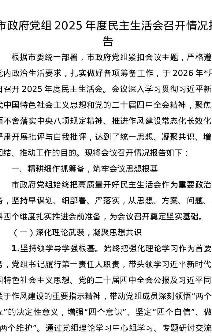 市政府党组2025年度xxxxx召开情况报告