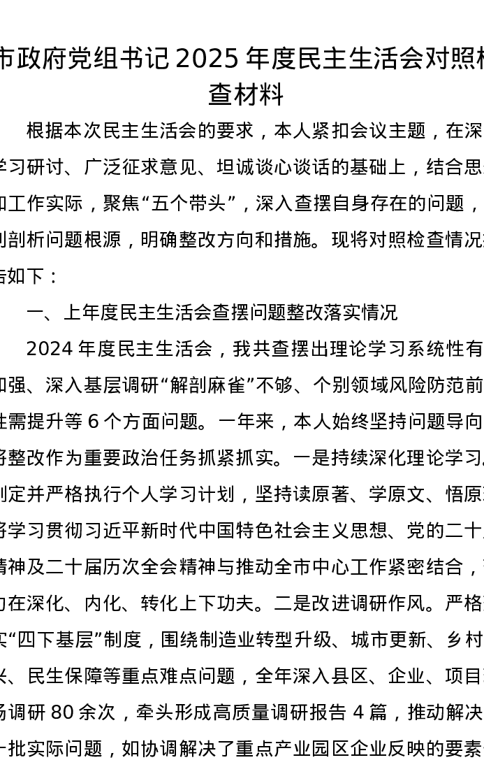市政府党组书记2025年度xxxxx对照检查材料