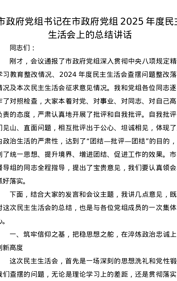 市政府党组书记在市政府党组2025年度xxxxx上的总结讲话