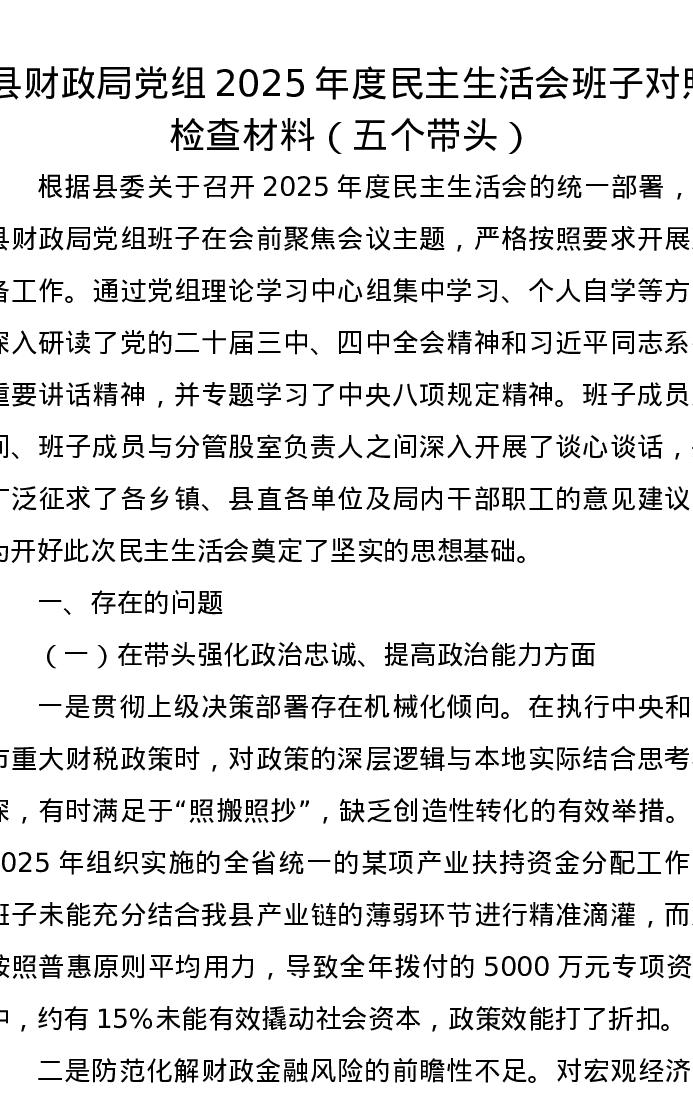 县财政局党组2025年度xxxxx班子对照检查材料(五个带头)
