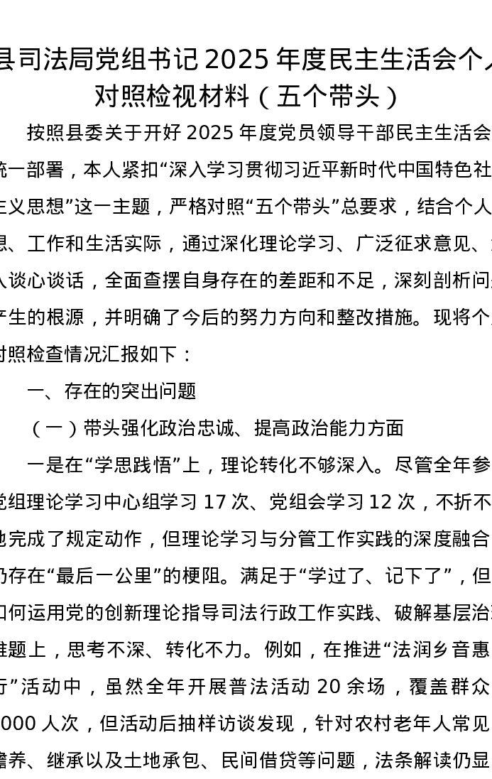县司法局党组书记2025年度xxxxx个人对照检视材料(五个带头)