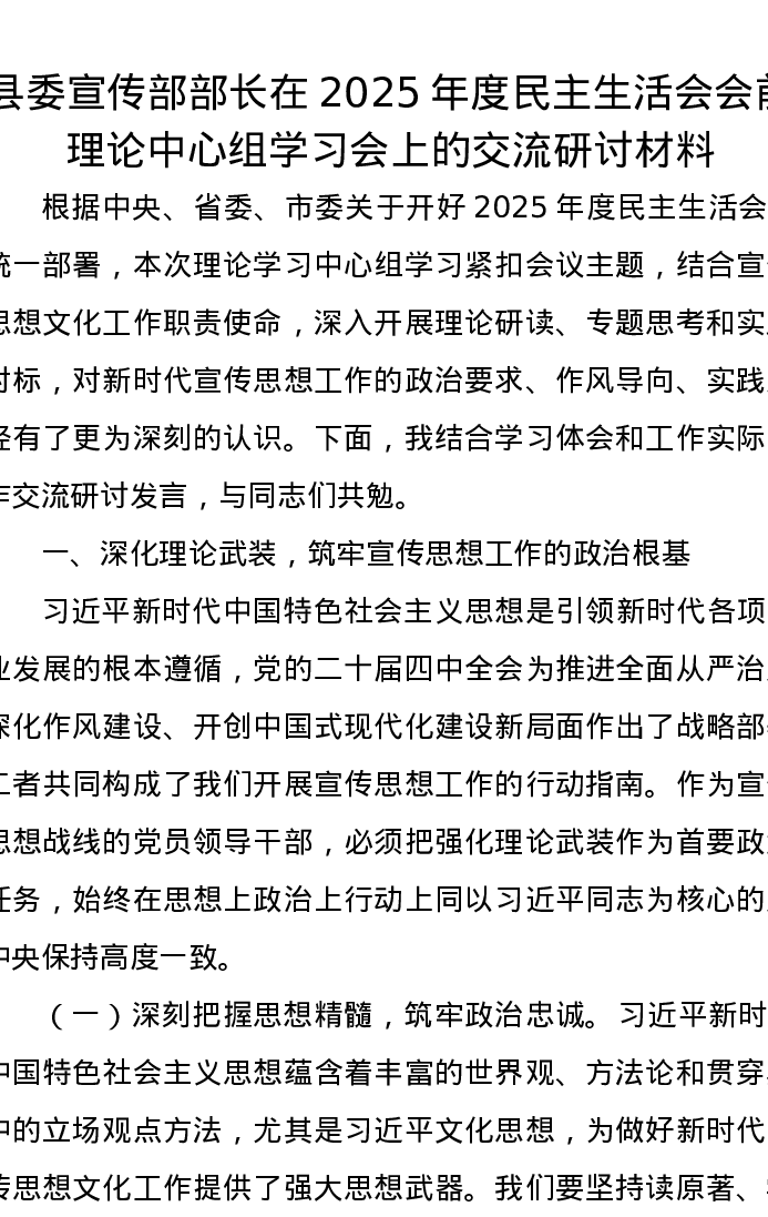 县委宣传部部长在2025年度xxxxx会前理论中心组学习会上的交流研讨材料