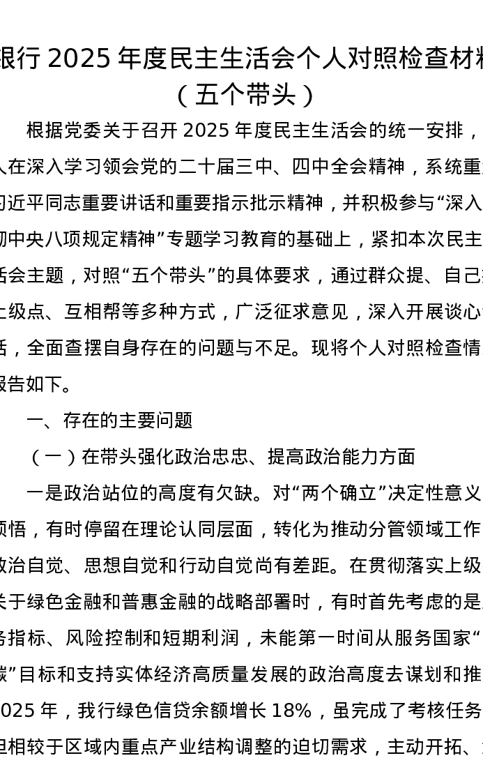 银行2025年度xxxxx个人对照检查材料(五个带头)