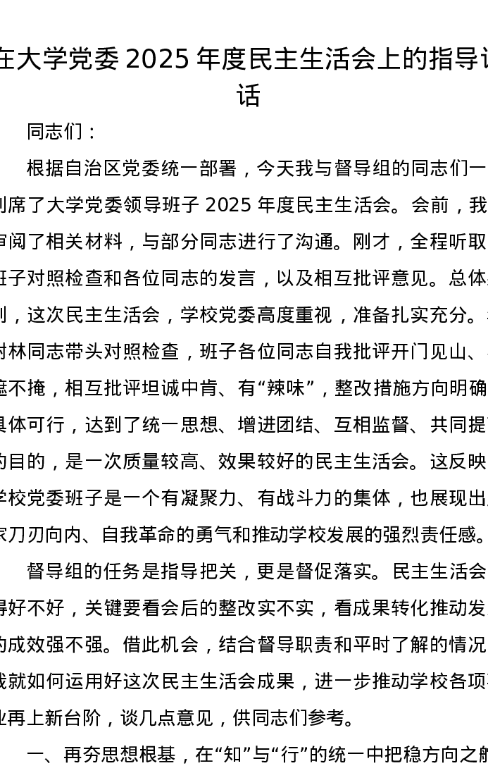 在大学党委2025年度xxxxx上的指导讲话
