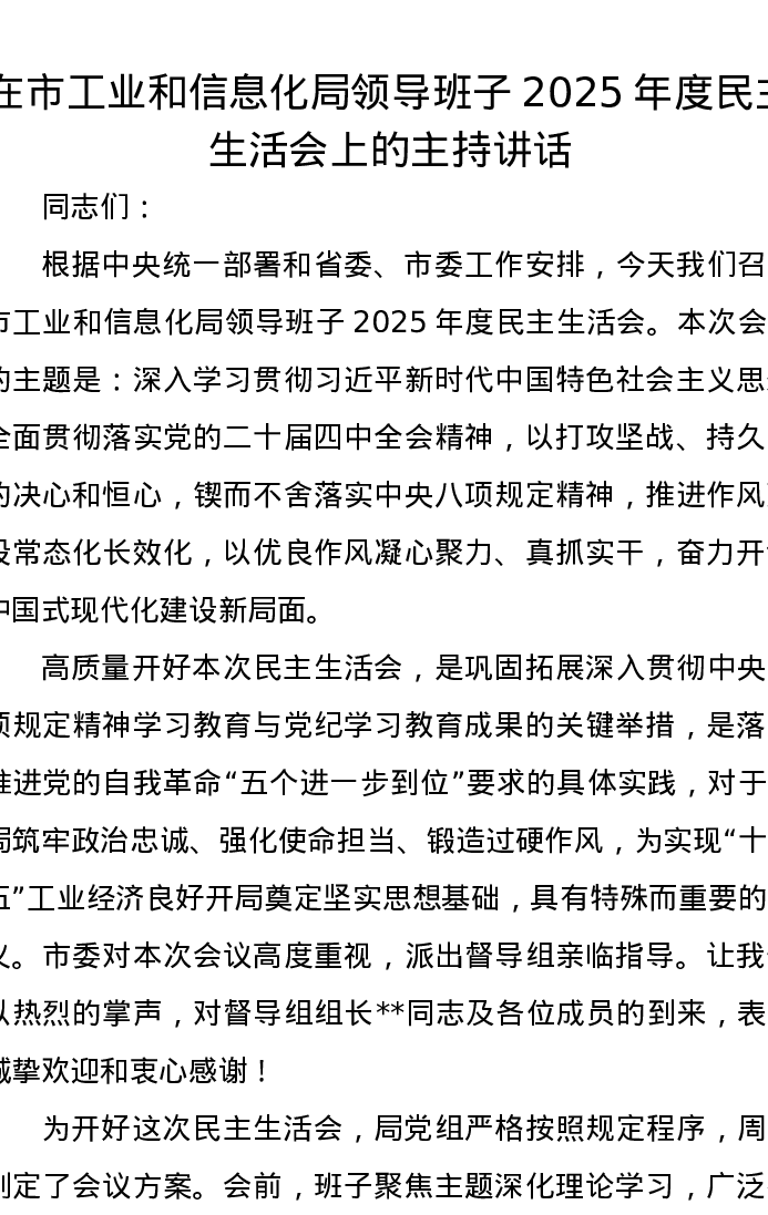 在市工业和信息化局领导班子2025年度xxxxx上的主持讲话